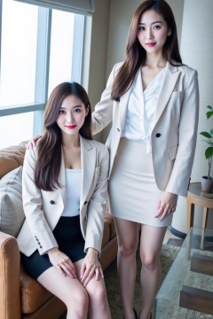 long hair, looking at viewer, smile, multiple girls, skirt, brown hair, shirt, black hair, dress, 2girls, sitting, standing, jacket, white shirt, indoors, black skirt, white dress, high heels, pillow, window, formal, white jacket, suit, dual persona, pencil skirt, red lips, office lady