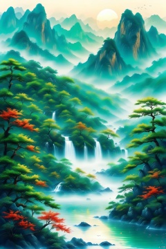 guofengshanshuihua,piritual mountain,beautiful colors,crystal clear water,misty atmosphere,mountains rising and falling,lush green trees,flowing water,wondrous beauty,(best quality,4k,8k,highres,masterpiece:1.2),ultra-detailed,(realistic,photorealistic,photo-realistic:1.37),HDR,UHD,studio lighting,landscape,vivid colors,sharp focus