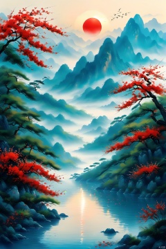 guofengshanshuihua,A picturesque scene with the grandeur of Chinese red, poetic elegance, and traditional elements, overlooking a tranquil river with the sun rising, crimson flowers floating on the water, and an ethereal mist enveloping the mountains. The scene exudes a sense of timeless beauty and harmony, capturing the essence of spring with deep green river waters, sparkling blue gemstones, and fresh, vivid colors. The entire landscape appears as if the heavens and earth have converged, creating a mesmerizing and serene atmosphere. The detailed depiction of the surroundings should have the best quality (4k,8k,highres,masterpiece:1.2) and be ultra-detailed with a realistic, photorealistic style (photo-realistic:1.37). The lighting should emphasize studio lighting, sharp focus, vivid colors, and an overall sense of tranquility.