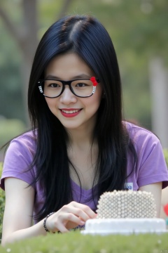 (1girl:1.3), (best quality, masterpiece, ultra high resolution),(photorealistic:1.3), (realistic:1.3), depth of field,(full body:1.4), (day:1.2), (cinematic lighting:1.2),1girl, long_hair, smile, shirt, black_hair, upper_body, short_sleeves, glasses, teeth, black_eyes, black-framed_eyewear, head_rest, realistic, purple_shirt