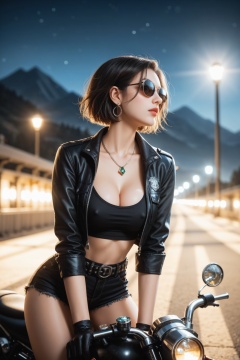 1girl,leaning_against_motorcycle,perfect_face,thin_face,tattoos,narrow_waist,large_breasts,cleavage,sideways,sexy_pose,cropped_shirt,black_short_suit_jacket,bare_abdomen,micro_shorts,hand_in_pants_pocket,black_gloves,sunglasses,posing,(flying_hair:0.8),belt, (bubble_butt,large_butt:0.6),covered_nipples, long_legs,slim,tapered_pixie_cut,earrings,necklaces,gemstones,