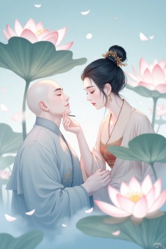 A serene, intimate scene of a woman applying makeup to a man. The woman, with delicate features and dark hair styled in an elaborate updo adorned with gold ornaments, is meticulously applying a cosmetic detail to the man's forehead. His expression is peaceful, with closed eyes, and he is dressed in light gray-blue robes. The woman is in a light peach-blush colored dress, adorned with gold details and a reddish-brown bodice. Soft, muted colors dominate the scene, with pale blues and pinks creating a tranquil atmosphere. Lotus flowers and leaves, in shades of pink and teal-green, form a gentle background, hinting at a serene, natural setting. The style suggests an Asian-inspired, digital painting with smooth lines, detailed features, and subdued emphasis on lighting creating a soft, romantic feel. The composition presents a delicate balance between the characters, softly focused on the couple's interaction. Gentle lighting emphasizes the woman's hands and the man's face, while artistic fog or mist creates a dreamy background. Traditional Chinese painting influences are subtle but present.
