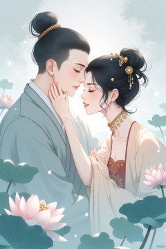 A serene, intimate scene of a woman applying makeup to a man. The woman, with delicate features and dark hair styled in an elaborate updo adorned with gold ornaments, is meticulously applying a cosmetic detail to the man's forehead. His expression is peaceful, with closed eyes, and he is dressed in light gray-blue robes. The woman is in a light peach-blush colored dress, adorned with gold details and a reddish-brown bodice. Soft, muted colors dominate the scene, with pale blues and pinks creating a tranquil atmosphere. Lotus flowers and leaves, in shades of pink and teal-green, form a gentle background, hinting at a serene, natural setting. The style suggests an Asian-inspired, digital painting with smooth lines, detailed features, and subdued emphasis on lighting creating a soft, romantic feel. The composition presents a delicate balance between the characters, softly focused on the couple's interaction. Gentle lighting emphasizes the woman's hands and the man's face, while artistic fog or mist creates a dreamy background. Traditional Chinese painting influences are subtle but present.