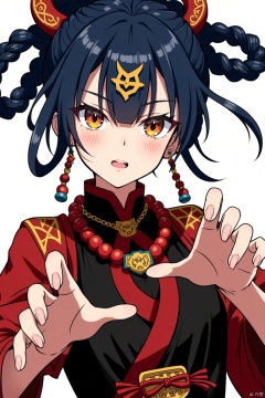 Anime girl, stylized Chinese-inspired outfit, intense expression, fiery orange eyes, dark blue hair in intricate braids,  red and black clothing,  detailed bead necklace,  red trim,  intricate symbols on forehead,  unique character design,  dynamic pose with hands outstretched,  fangs visible,  sharp features,  stylized art,  vibrant colors,  strong and confident mood,  manga-style,  close-up view,  detailed facial features,  realistic-looking hands and fingernails,  traditional Chinese dress.