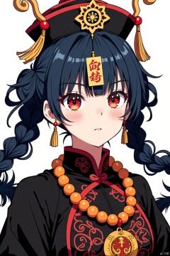 Anime girl, traditional Chinese attire, dark black qipao with fiery orange beaded necklace and pendant. Intricate, detailed embroidery on qipao, with red accents. Dark blue, styled hair in pigtails, high-quality anime aesthetic. Bright, vibrant red eyes, soft blush on cheeks. Slight pensive expression. Full-body portrait, frontal view, focused on the subject. High-contrast lighting, dramatic lighting techniques. Distinct, bold lines defining character's features. Strong, well-defined composition elements. Classic anime style, realistic features combined with a stylized aesthetic. Focus on detailed features. Chinese inspired, Asian art style.
