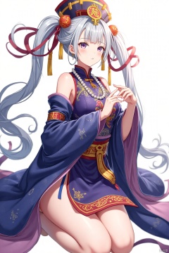 Anime girl, elegant pose, flowing light gray pigtails, traditional Chinese inspired attire. Deep purple and royal blue layered outfit, detailed embroidery showcasing a serene, almost meditative mood. Light orange and yellow decorative elements, like scrolls, ribbons, and tassels. Subtle pearl necklace, soft light, full-body shot with a slightly elevated perspective, showcasing graceful leg lines. Character's expression is serene and calm, soft features, and large eyes. Detailed depiction of smooth skin, elaborate clothing with flowing designs, ribbons, and embellishments. Vivid color palette, contrasting deep purples, blues, and whites. Anime style. Focus on character design, fashion, and elegant aesthetic.,