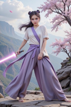 The colors are soft, with a pastel palette, including the pinkish-purple hues of the swords and the pale pinks of the blossoms. The lighting suggests a soft, diffused, natural light source. The style appears to be highly stylized, with a noticeable focus on dynamic composition and soft edges, typical of digital art. The woman appears to be standing on a rocky cliff face. The style is anime or digital illustration, and the background is a beautiful, serene landscape.,detailed city,LILITH