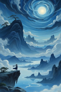 A solitary figure stands atop a towering, craggy peak, bathed in ethereal blue light. Vast, swirling clouds and a colossal, ethereal moon-like orb dominate the sky. The figure, garbed in flowing, dark robes, gazes out at a landscape of tranquil, flowing water and misty mountains. Soft pastel blues and grays blend seamlessly, creating a sense of serene wonder. The landscape is detailed with swirling patterns, evoking depth and a sense of movement. Water is depicted as smooth, rippling, and elegant, with a detailed rocky shoreline. High perspective, serene atmosphere, painterly style, oriental aesthetics. Detailed layering of colors and textures, with a soft, diffused light source. Misty clouds and flowing water elements are seamlessly integrated, conveying a quiet majesty. Japanese aesthetic. Ink wash painting style. The figure's pose and expression capture a moment of contemplation.