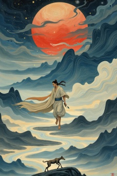 A dramatic, stylized illustration depicting a figure, possibly a man, in motion amidst a majestic landscape. Central figure appears to be walking or running, dynamically posed, with a determined expression, holding something in his hands. The figure is rendered in light-toned, muted earth colors with accents of ochre and cream against a backdrop of a large, fiery red sun situated within a dramatic, ethereal sky of soft blues and grays. Clouds, textured with delicate brushstrokes, swirl and gather around the figure creating a sense of depth and movement. The landscape surrounding the figure features rolling hills and streams, depicted in muted blues and deep greys. The style evokes a sense of ancient Chinese or Japanese traditions, with a touch of allegorical fantasy. A small, light-colored animal, resembling a deerhound, is also present in the foreground, reacting to the central figure. The overall mood is thoughtful yet vibrant, infused with a sense of wonder. Soft, diffused light bathes the scene, highlighting the central figure and the landscape, creating a sense of reverence. The overall aesthetic is illustrative, rendered with smooth, brush-like texture, resembling traditional painting techniques, yet rendered with a modern sensibility.