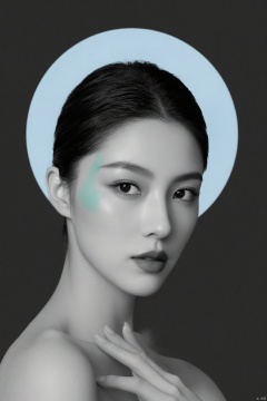 relegant woman, black-and-white photography, soft sea blue and mint green paint brush strokes on face, minimalist style, light sea blue circle behind head, best quality,masterpiece,plns,xfg