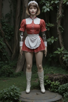 A brutal horror fantasy featuring a tall living mannequin with short bobcut gradient blonde and brown hair, bright yellow eyes, and red lipstick. She is wearing a red maid dress on top of a white collared shirt with long sleeves, a maid headdress, a frilly and a white waist apron and high heel knee boots. Doll joints can be seen on her neck, fingers, and knees. Cracks can be seen on her legs. A side perspective as she is standing in a desolate garden with overgrown vines and grass. A soft smile and be seen on her face as she stares at the viewer.,detailed city,UNI_SCI_FI_CORE
