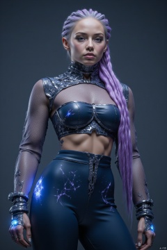 Masterpiece, semi realistic, dramatic angle, face close up portrait of a beautiful and stunning woman, otherworldly look, her hair a cascade of iridescent silver and lavender braids that sweep down past her waist, woven with thin metallic threads that glint as she moves, A half-shaved side reveals intricate henna-like designs inked across her scalp, adding an edge to her ethereal vibe, outfit is a fusion of futuristic and bohemian, a high-neck asymmetrical crop top made of translucent fabric that shimmers under light, one sleeve that extends to her wrist in a cascade of translucent ruffles, high-waisted wide-leg pants in deep midnight blue, embroidered with glowing constellations that appear to shift and twinkle as she moves, hands are adorned with delicate silver rings and filigree gloves, futuristic mysticism, stunning makeup, beautiful lipstick, beautiful lips, eyeliner, eye shadow, stunning eyes, roams through cosmic markets set on floating islands surrounded by shimmering nebulae and star-filled skies, high-res, best quality, intricate details, ultra details, cinematic, good lighting, vibrant colors, very detailed, octane render, ray tracing,UNI_SCI_FI_CORE