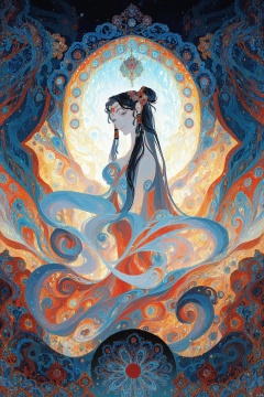 score_9,score_8_up,score_7_up,score_6_up,Digital art,Official art,8k wallpaper,super detailed,beautiful and beautiful,masterpiece,best quality,(fractal art:1.3),lines,illustration,very detailed,bright colors,romanticism,dark background,A girl, beautiful portrait, long hair, hair accessories composed of jewels and carnelian hanging on both sides of the hair, small flowers of various colors dotted in the middle, deep-set eyes, forehead jewels, hair tubes hanging on both sides, absolutely long hair, hair tubes, slight freckles, sunlight on the face, an infectious smile, elaborate attire with traditional patterns, exquisite digital art illustration, fractal art, dynamic composition.A beautiful portrait of a young girl with long, lustrous hair. Her hair is adorned with jewelry and agate, with decorative elements hanging on either side, interspersed with small flowers of various colors in the middle, giving a richly ornamental feel. Her deep, expressive eyes are captivating, and her forehead is embellished with jewels. Hair tubes cascade down both sides, and her long locks are emphasized. Subtle freckles dot her skin, adding character to her sun-kissed face. Her infectious smile is full of vitality, and she is dressed in elaborate attire that features traditional patterns. The artwork is a fine digital illustration with fractal art elements, composed dynamically to draw the viewer in.,