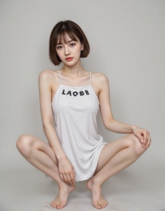 A woman with short brown hair, blue eyes looking ahead, squatting barefoot, holding a T-shirt to cover her fair skin. The T-shirt had the words LAOBB written on it, but only covered her chest and abdomen, revealing her shoulders and collarbones. Her bare shoulders were strapless, and her slender legs were mostly exposed