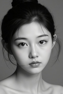 liangyi fenwei,this black-and-white photo captures the otherworldly,brooding expression of a young girl with a delicate oval face with smooth skin and a slight blush on her cheeks,probably because of the light,her dark hair loosely pulled in a bun,strands of hair outlining her face,she looks straight into the camera,the soft light making her large almond-shaped eyes stand out,the light cast a soft glow on her face,highlighting her delicate facial features,creating a soft,almost dreamy atmosphere,