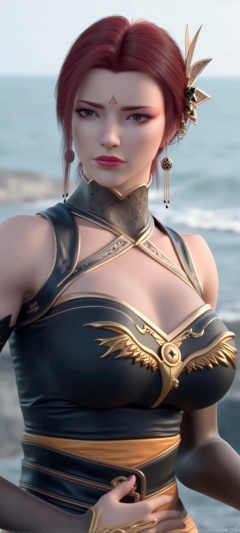 (high definition, Best quality, masterpiece, 4K, exquisite skin), YaFei, 1girl, solo,cleavage, seaside, cowboy_shot, learning forward