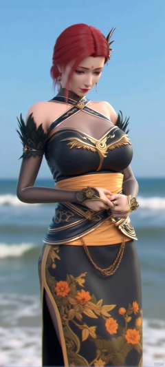 (high definition, Best quality, masterpiece, 4K, exquisite skin), YaFei, 1girl, solo,cleavage, seaside, (cowboy_shot), learning forward