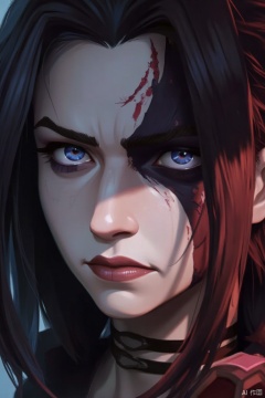 adorned with black and red accents. His eyes are a piercing blue