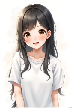 1 beautiful girl, 1 girl, black hair, long hair, powder blusher, upper body, white shirt, short sleeve, white background, adding details, clean, yellow tone, grinning,