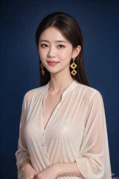 1girl, solo, looking at viewer, smile,  brown hair,  brown eyes, jewelry, closed mouth, upper body, earrings, lips, blue background, portrait, realistic, nose