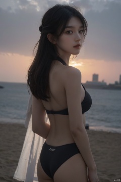 1girl,black hair,slim,very small breasts,simple_background,strong rim light,intense shadows,against backlight at dusk,beautiful purple sunset at beach,maid swimsuit,nipples under clothes,topknot,outdoor,back