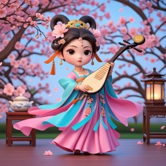 Q edition,shinv, A cute, young Asian girl rocks a traditional Chinese getup with a vibrant pink and turquoise dress, flaunting intricate floral patterns. She's got a small, round face, big expressive eyes, and a sweet smile. Her hair is styled in a fancy updo with flowers and a snazzy gold crown. She's holding a traditional Chinese zither, decked out in blue and gold, in her hands. The scene is set in a traditional Chinese room with wooden furniture, a lantern, and a backdrop of cherry blossom trees in full bloom, adding to the serene, festive vibe.<lora:shinv_v1:0.8>,