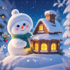 shengdan,A cute,chubby snowman with a fluffy white body,a bright orange carrot nose,and rosy cheeks stands in a snow-covered scene. It's rocking a green scarf and a matching hat. Next to it,a tiny wooden house with a glowing yellow window sits on the snow. The background is filled with snow-covered trees and a clear,starry night sky. Red berries hang around the snowman,adding a festive touch. The whole scene is merry and cozy,with a whimsical,cartoonish vibe.,,<lora:shengdan_v1-000016:0.8>