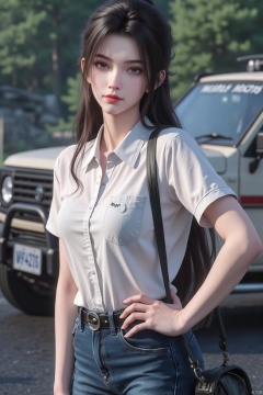 1girl, solo, long hair, looking at viewer, brown hair, shirt, brown eyes, standing, white shirt, short sleeves, cowboy shot, outdoors, pants, bag, blurry, lips, hand on hip, blurry background, denim, ground vehicle, t-shirt, clothes writing, motor vehicle, jeans, realistic, car, road, photo background