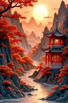 (best quality,4k,8k,highres,masterpiece:1.2),ultra-detailed,(realistic,photorealistic,photo-realistic:1.37),ancient Chinese architecture,serene mountains and rivers,red atmosphere,strong contrast,traditional Chinese elements,dragon motifs,ornate rooftops,detailed carvings,stone pathways,flowing water,autumn leaves,evening sky,soft golden light,shadows,sharp focus,physically-based rendering,extreme detail description,professional,vivid colors,bokeh,landscape,concept art,wallpaper