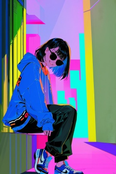 Digital art,illustration,Aksha _ Eve,1girl, solo, smile, looking at viewer,official Cloth,sitting on stairs outdoors city street,on night,sunglasses,Celluloid,High-quality, digital illustration, anime style, vibrant colors, smooth animation, detailed backgrounds, dynamic poses, expressive characters, stylish effects, futuristic elements, cyberpunk aesthetics, soft shading, clean lines, intricate designs, glowing accents, atmospheric lighting, rich textures, harmonious composition, engaging narrative, polished finish, 8k resolution, trending on Artstation, Unreal Engine 5, very aesthetic, absurdres.