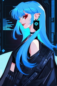 ,digital art illustration,Blue hair, barcode earring, gothic clothing, confident smile, mysterious, edgy, futuristic, cyberpunk, cool, enigmatic.