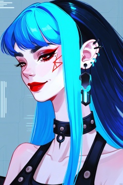 ,digital art illustration,Blue hair, barcode earring, gothic clothing, confident smile, mysterious, edgy, futuristic, cyberpunk, cool, enigmatic.