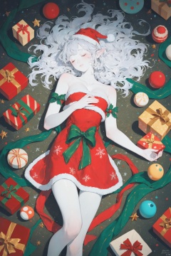 score_9,score_8_up,score_7_up,score_6_up,fractal art,a robot girl wearing Christmas clothes is lying on a soft bed,surrounded by colorful Christmas gift boxes arranged in fractal art.white skin,white long messy hair,close eyes sleeping,The dynamic and artistic composition creates a beautiful and childlike atmosphere,creating a Christmas atmosphere,