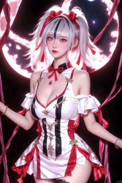 1girl solo breasts looking at viewer black hair thighhighs dress ribbon cleavage bare shoulders twintails jewelry medium breasts hair ribbon white hair multicolored hair white dress bracelet white thighhighs moon