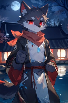 masterpiece,best quality,perfect anatomy,bright eyes,watery eyes,furry,wolf,(felis:0.25),male,solo,baggy clothing,detailed eyes,male focus,open clothes,(Water black Tang Costume:1.1),(night:1.1),(red eyes:1.1),angle:1.1),black scarf,a slim and well-proportioned figure,,sketch,body fur,anthro
