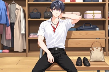 a cartoon depiction of an anime character is seated on a wooden bench. The character is dressed in a white button-down shirt, black pants, and a black belt. The outfit is adorned with a silver necklace and a red tie. To the right of the character, a pair of black shoes are placed on the bench. In the background, shelves are filled with clothes and purses.