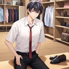 a cartoon depiction of an anime character is seated on a wooden bench. The character is dressed in a white button-down shirt, black pants, and a black belt. The outfit is adorned with a silver necklace and a red tie. To the right of the character, a pair of black shoes are placed on the bench. In the background, shelves are filled with clothes and purses.
