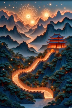 zhidiaoshanshui,(night,Great Wall of China,fireworks,spectacular,grandeur,traditional craftsmanship,golden light,aerial view,award-winning masterpiece,ultra HD,enhanced clarity,enhanced details),(best quality,4k,8k,highres,masterpiece:1.2),ultra-detailed,(realistic,photorealistic,photo-realistic:1.37),HDR,UHD,studio lighting,ultra-fine painting,sharp focus,physically-based rendering,extreme detail description,professional,vivid colors,bokeh,night photography,panoramic view,wide-angle,celebration,Chinese architecture,scenic,beautiful landscape,atmospheric lighting,dramatic sky,starlit night,nighttime scenery,cultural heritage,iconic landmark,ancient structure,festive atmosphere