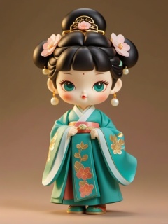 manghe,c4d, A detailed, stylized figurine of a young Asian woman flaunts a classic Chinese vibe with a traditional getup. She's rocking a teal kimono with gold and white floral patterns, and her hair's styled into big, round buns topped with gold hairpins. Her big, expressive peepers, rosy cheeks, and soft pink lips give her a youthful, cute look. The figurine's crafted from smooth, glossy plastic, with a plain beige background making her stand out.,<lora:manghe_v1-000010:0.8>