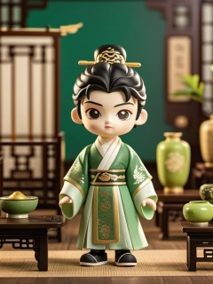 manghe,c4d, A super detailed figurine of a young Chinese dude in traditional gear, rocking a green kimono with fancy gold patterns, white sleeves, and black kicks. His black hair is styled in a high bun with a small ornament. The backdrop shows a chill indoor scene with wooden furniture, a vase, and a window. The figurine's got a soft, realistic vibe, with soft lighting and intricate textures.,<lora:manghe_v1-000010:0.8>
