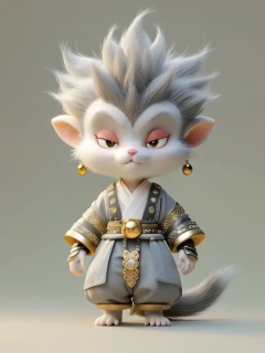 manghe,c4d, A super detailed CGI rendering of a small, human-like critter with a fluffy, spiky grey mane and white fur. The creature's got big, droopy eyes and a tiny pink snout. It's rocking a loose, grey kimono-style outfit with fancy golden bling on the sleeves and a belt. Big, gold hoop earrings dangle from its ears. The background is a plain, light beige. The whole thing has a cute, whimsical vibe with a hint of fantasy.,<lora:manghe_v1-000010:0.8>