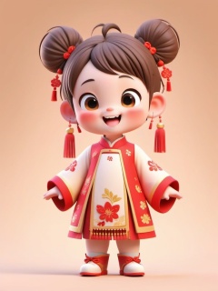 manghe,c4d, A super cute digital 3D render of a little girl rocking a traditional Chinese outfit. She's got big, expressive brown eyes, rosy cheeks, and a wide grin. Her hair's done up in two high buns with red bows, and she's sporting red tassel earrings. Her dress is red with gold floral patterns and a white underlay, and she's wearing red shoes. The background's a soft beige gradient, making her stand out. The art style is whimsical and adorable, with a soft, pastel color palette.,<lora:manghe_v1-000010:0.8>