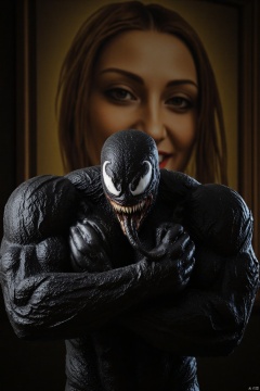 Iron Blood Warrior, with the iconic painting in the background. Venom's muscular, black form contrasts sharply with the soft, warm tones of the painting. The lighting is dramatic, casting deep shadows across Venom's face, while the