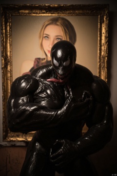 Iron Blood Warrior remains illuminated, her enigmatic smile visible. Venom's long, serpentine tongue reaches out towards the painting, creating a surreal and eerie atmosphere. The composition is centered, with Venom's powerful arms wrapped around the frame, emphasizing the juxtaposition between the monstrous and the timeless.,redcraft,SYMBIOTE STYLE