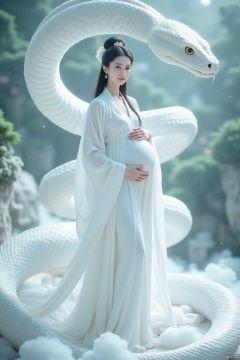 A pregnant woman in a flowing, white, traditional Chinese-style dress, posing serenely in front of a large, sculpted white snake. Soft, diffused light illuminates the scene, casting a gentle glow on the woman and snake. The woman's expression is serene and peaceful, her gaze gently directed forward. Her long, dark hair is styled in a traditional updo. The dress has flowing, billowing sleeves and a flowing skirt, creating a sense of ethereal movement. The woman's hands are gently placed on her pregnant belly. The large sculpted snake is a prominent feature, wrapping around and partially behind the woman, its scales detailed and smooth. The background suggests a lush, natural setting, with out-of-focus greenery providing a soft backdrop to the ethereal scene. The color palette is primarily white with subtle variations of light and shadow, lending a dreamlike and elegant atmosphere to the image. The composition is carefully balanced, drawing the viewer's focus to both the woman and the snake with a soft focus on the background. The image evokes a sense of peace, grace, and tranquility, drawing inspiration from traditional Asian aesthetics and imagery. Soft focus portrait, ethereal, artistic, cinematic, romantic, Asian inspired.