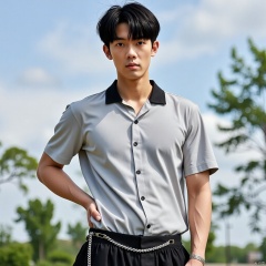 a man with black hair and blue eyes. He is wearing a light gray button up shirt with a black collar and black pants. He also has a silver chain around his waist. His left hand is on his hip and his right hand is resting on his head. The background is blurred, but you can see trees and a blue sky with white clouds.