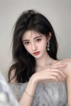 1girl, solo, long hair, looking at viewer, black hair, dress, bare shoulders, jewelry, earrings, necklace, black eyes, lips, head tilt, strapless, realistic