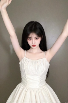 1girl, solo, long hair, looking at viewer, smile, black hair, dress, white dress, arms up, realistic, joints, doll joints, photo background