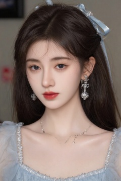 1girl, solo, long hair, looking at viewer, brown hair, shirt, black hair, dress, ribbon, jewelry, closed mouth, hair ribbon, upper body, earrings, blurry, lips, makeup, blue ribbon, red lips
