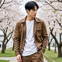 a medium-sized Asian man stands in front of a backdrop of cherry blossom trees. He is dressed in a brown jacket, a white t-shirt, and a pair of brown pants. His hair is short and dark, and his eyes are closed. His lips are slightly parted, as if he is looking to the left. The backdrop is blurred, and the trees are adorned with white flowers, adding a touch of color to the scene.